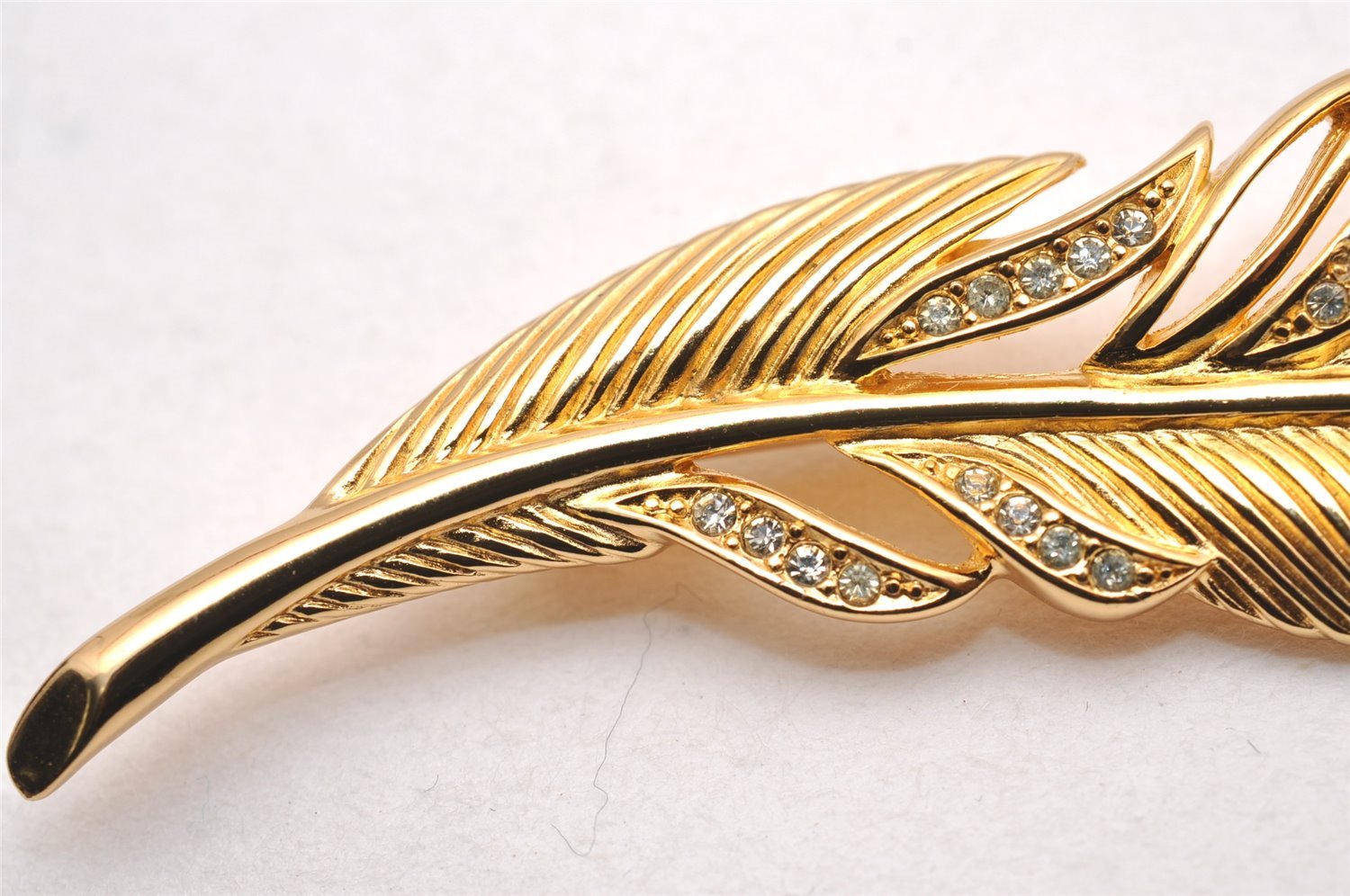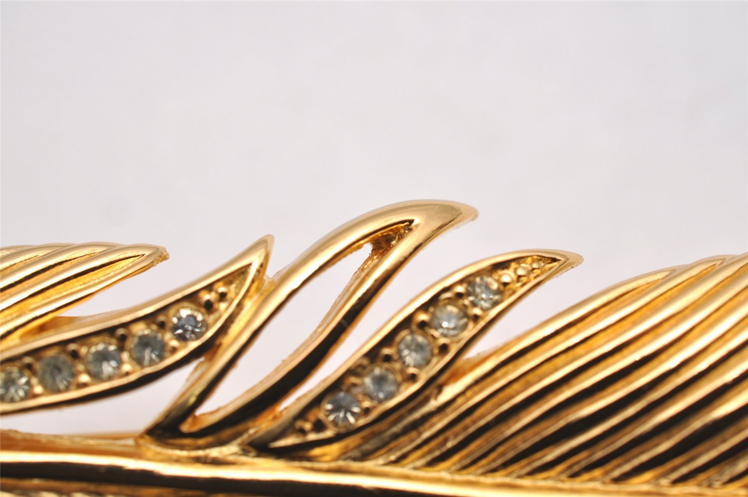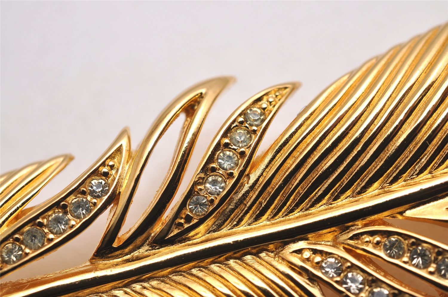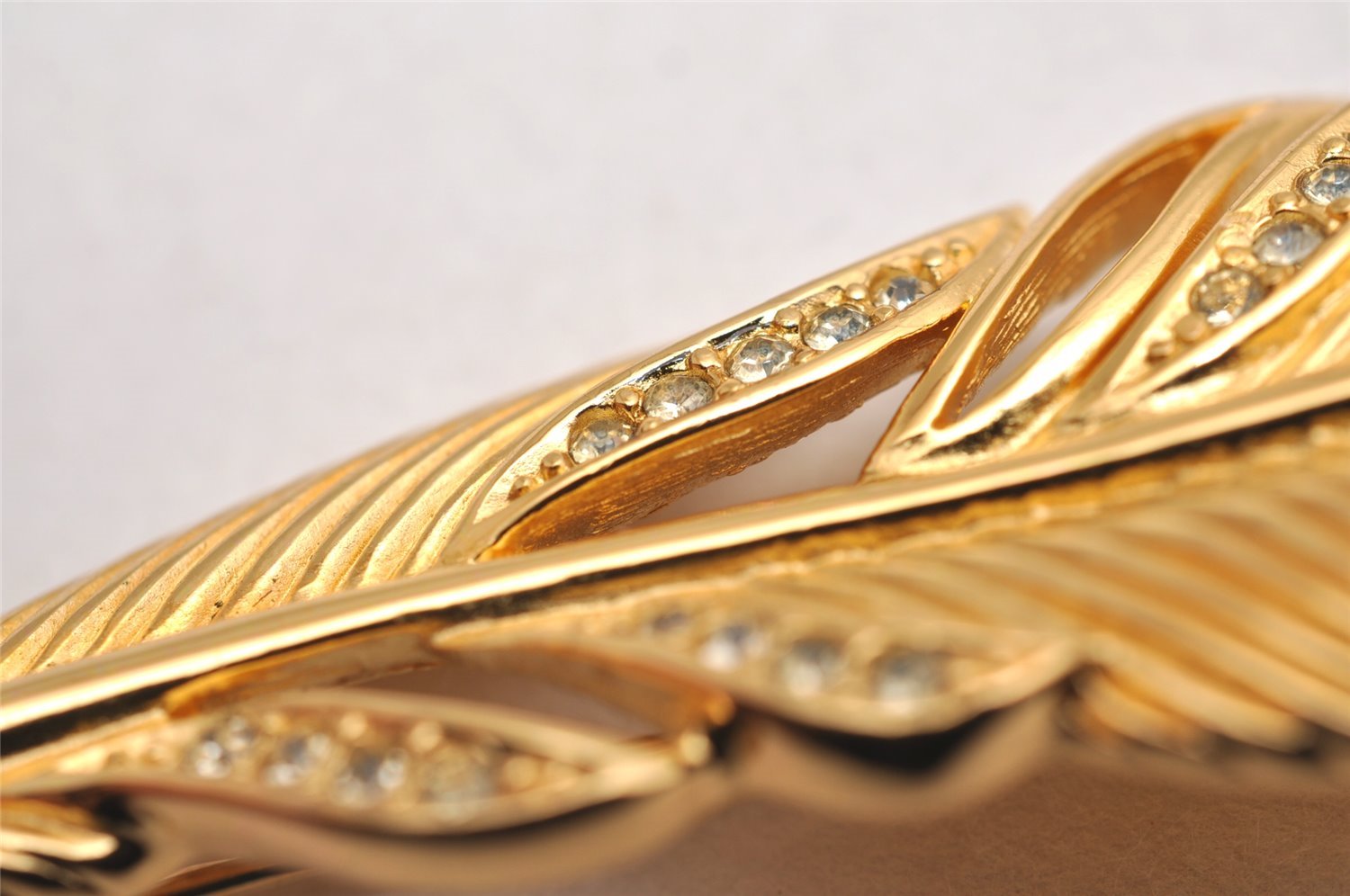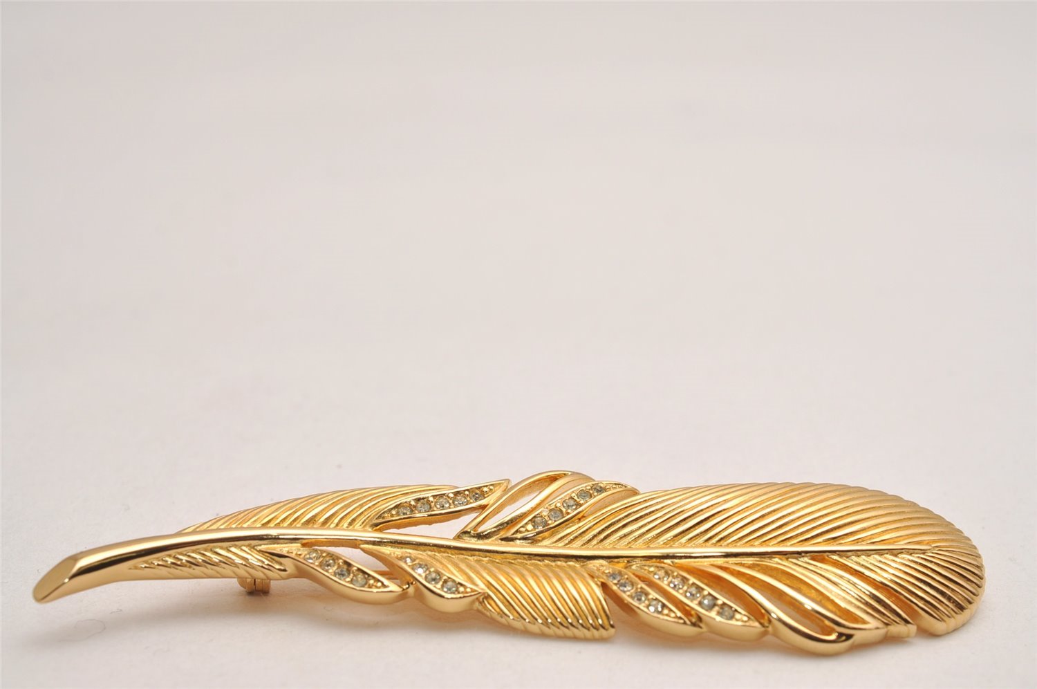 | Authentic Christian Dior Rhinestone Feather Motif Brooch Gold Tone CD Box | |