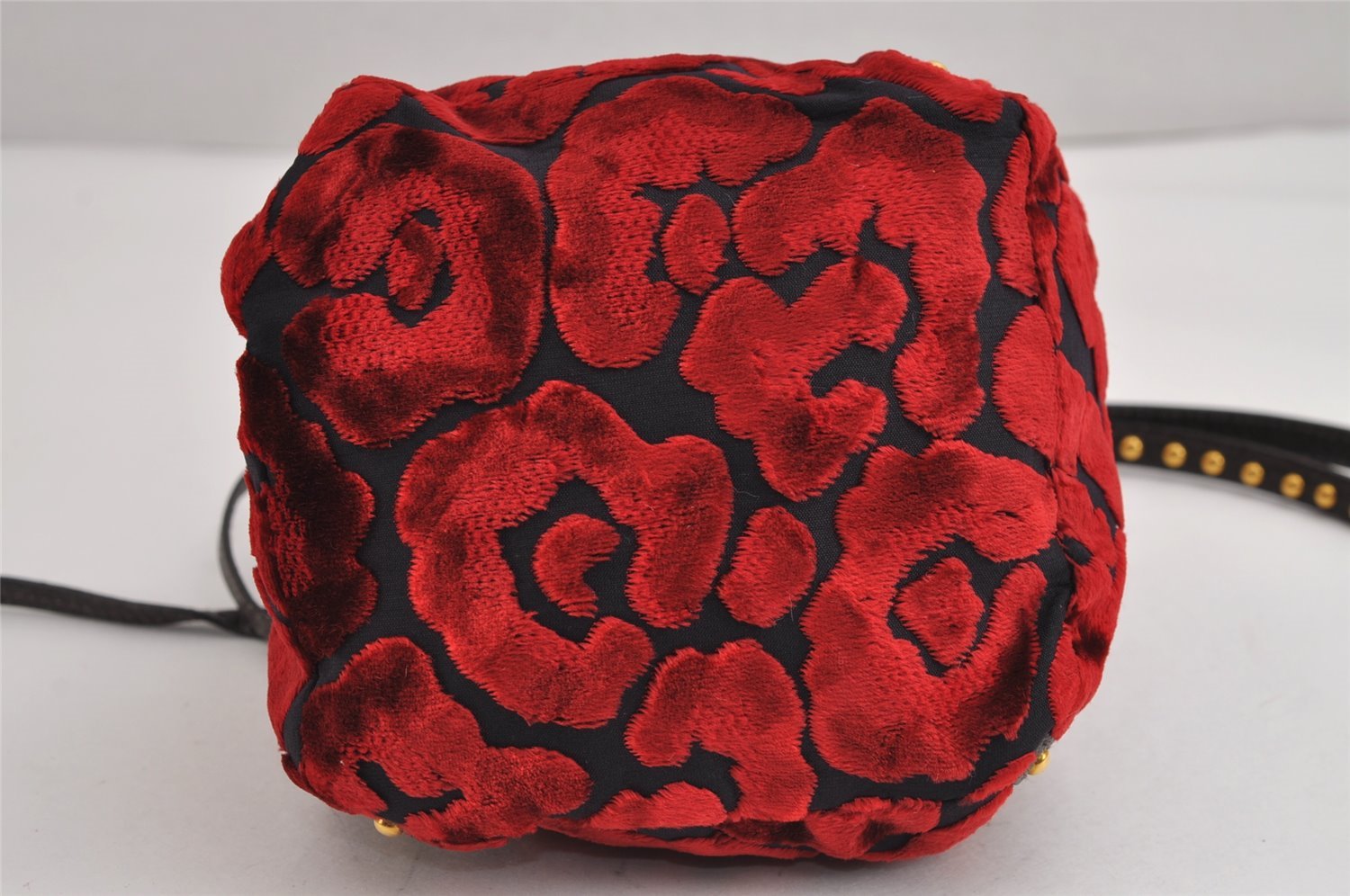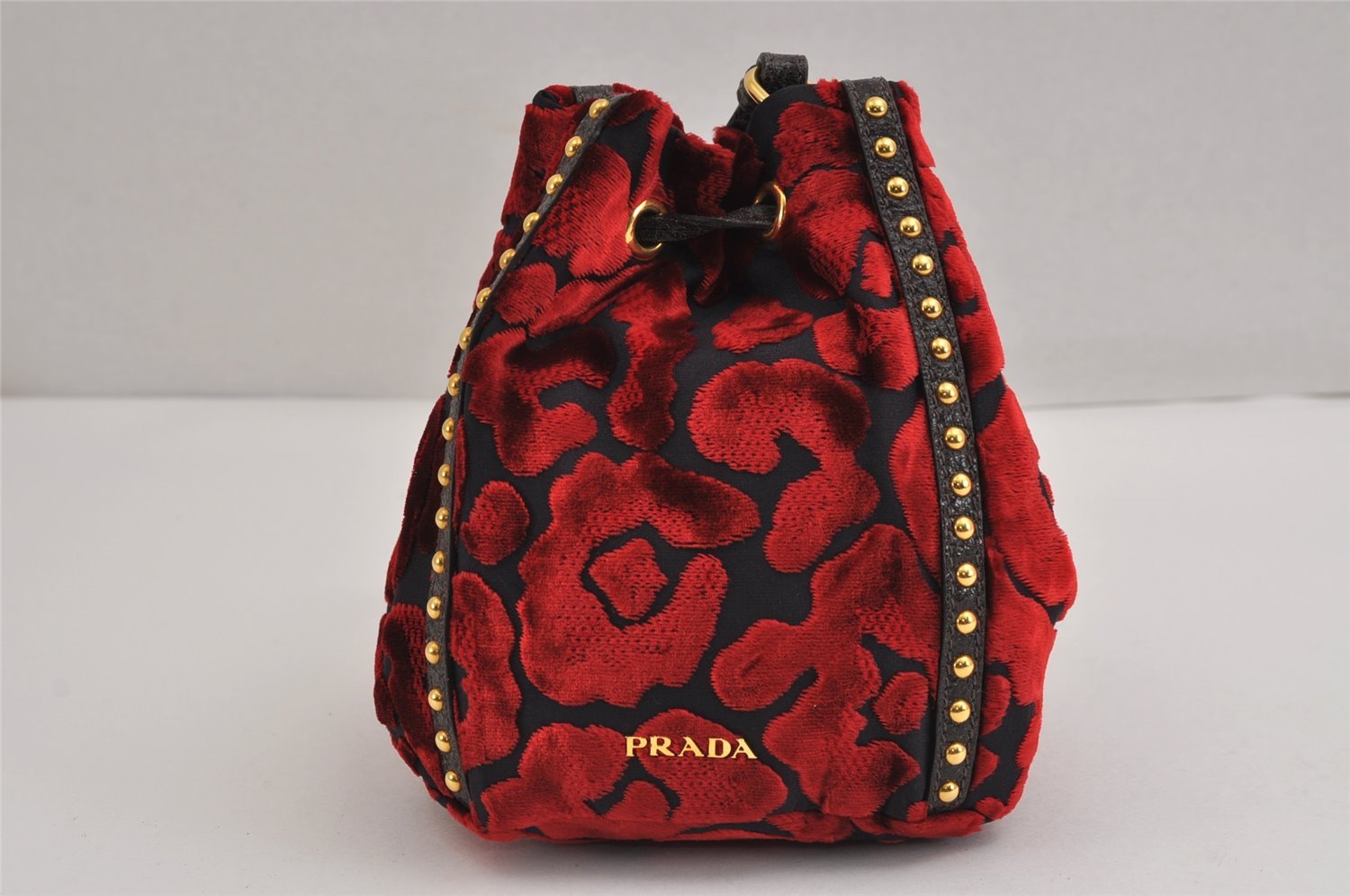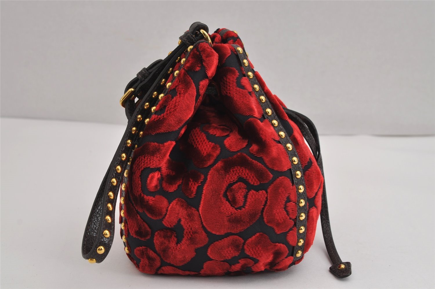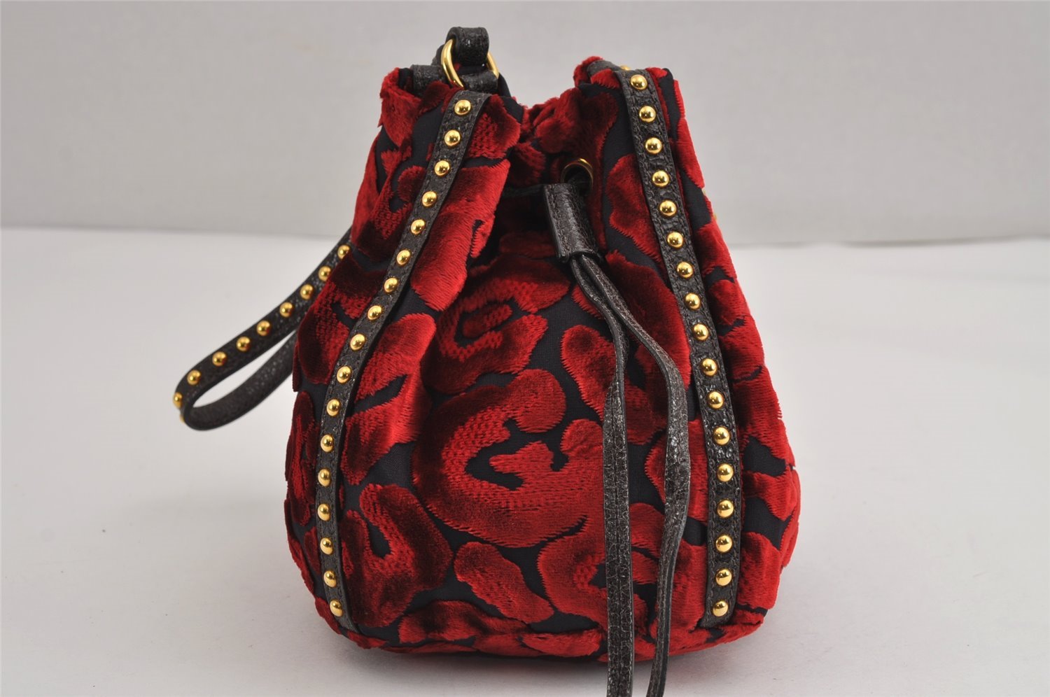 | Authentic PRADA Studs Velour Leather Drawstring Hand Bag Purse Red Black | |