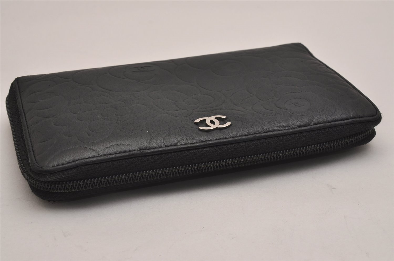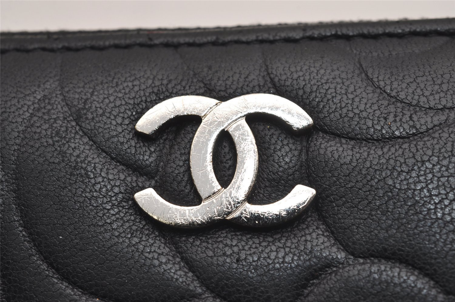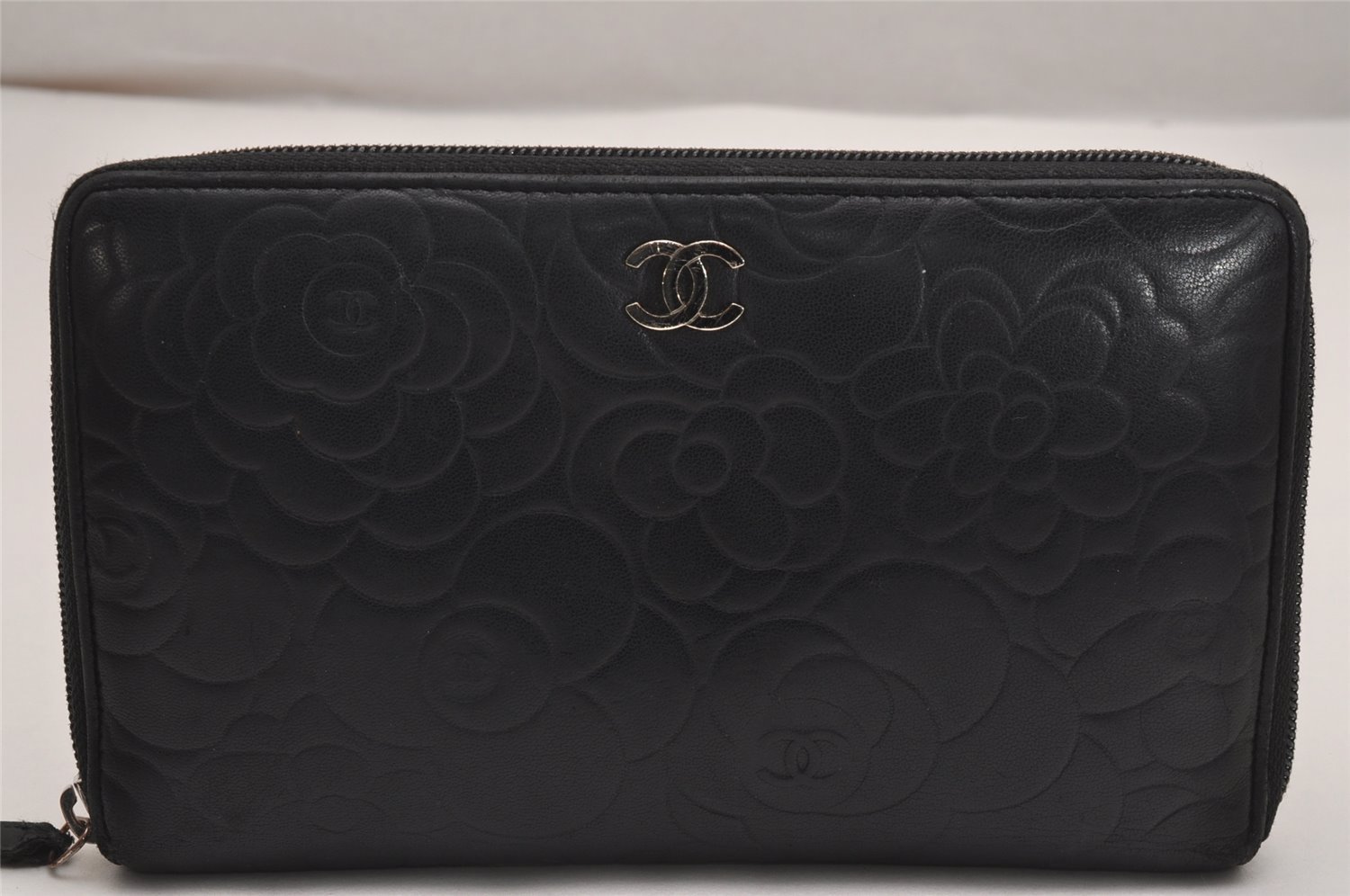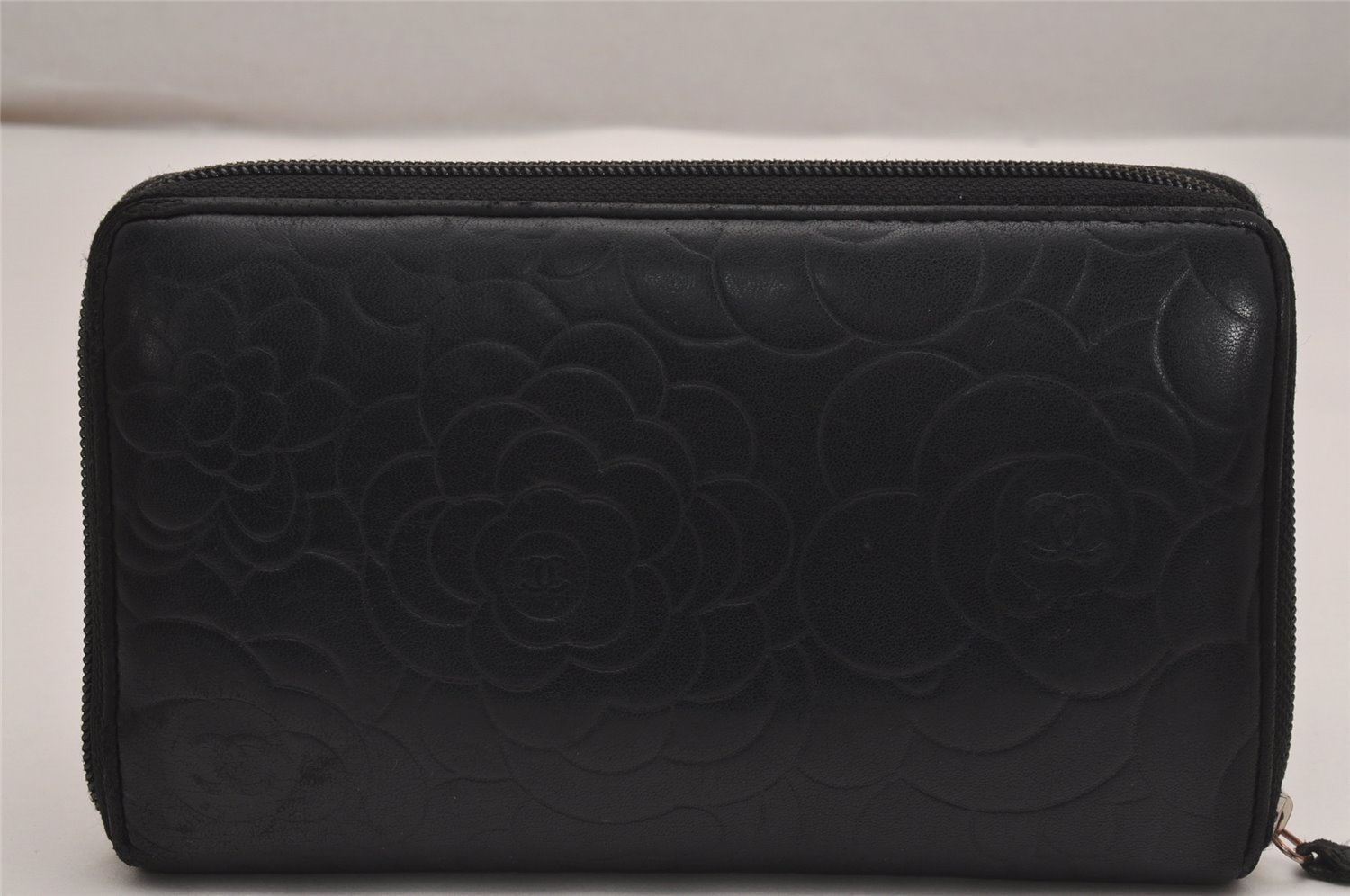 | Authentic CHANEL Camellia Calf Skin Round Zip Long Wallet Purse Black | |