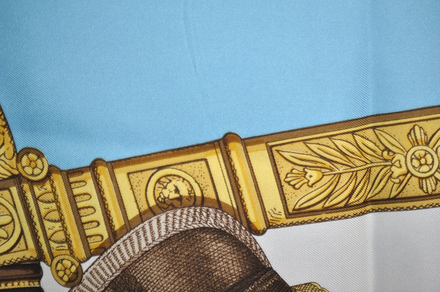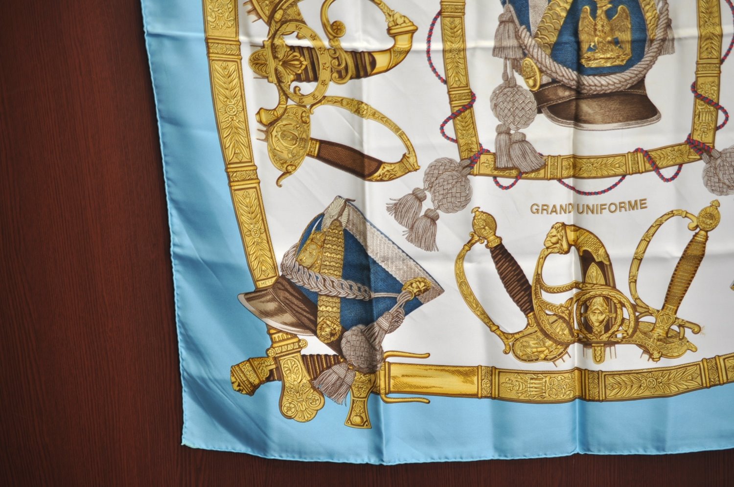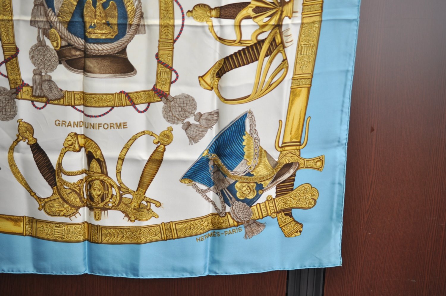 | Authentic HERMES Carre 90 Scarf "GRAND UNIFORME" Silk Light Blue | |