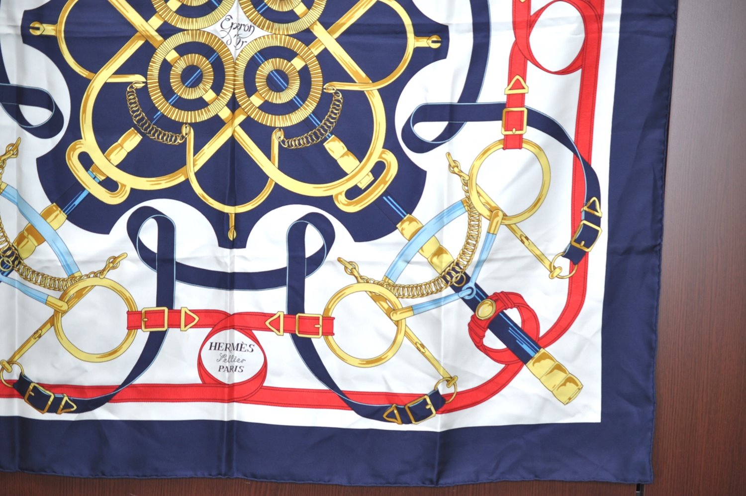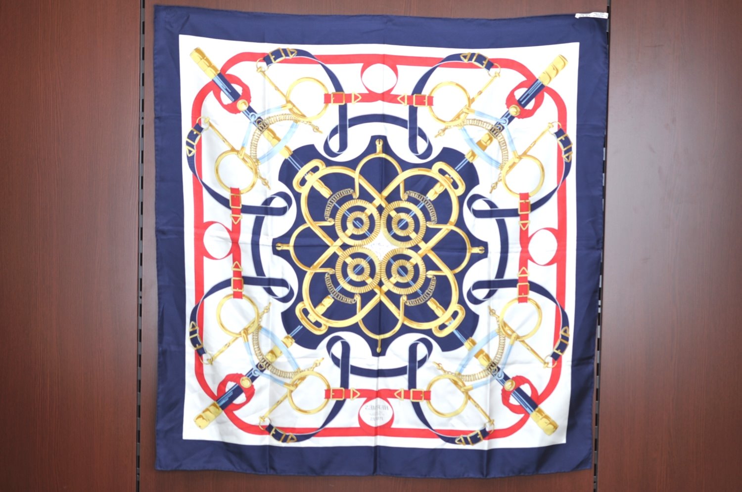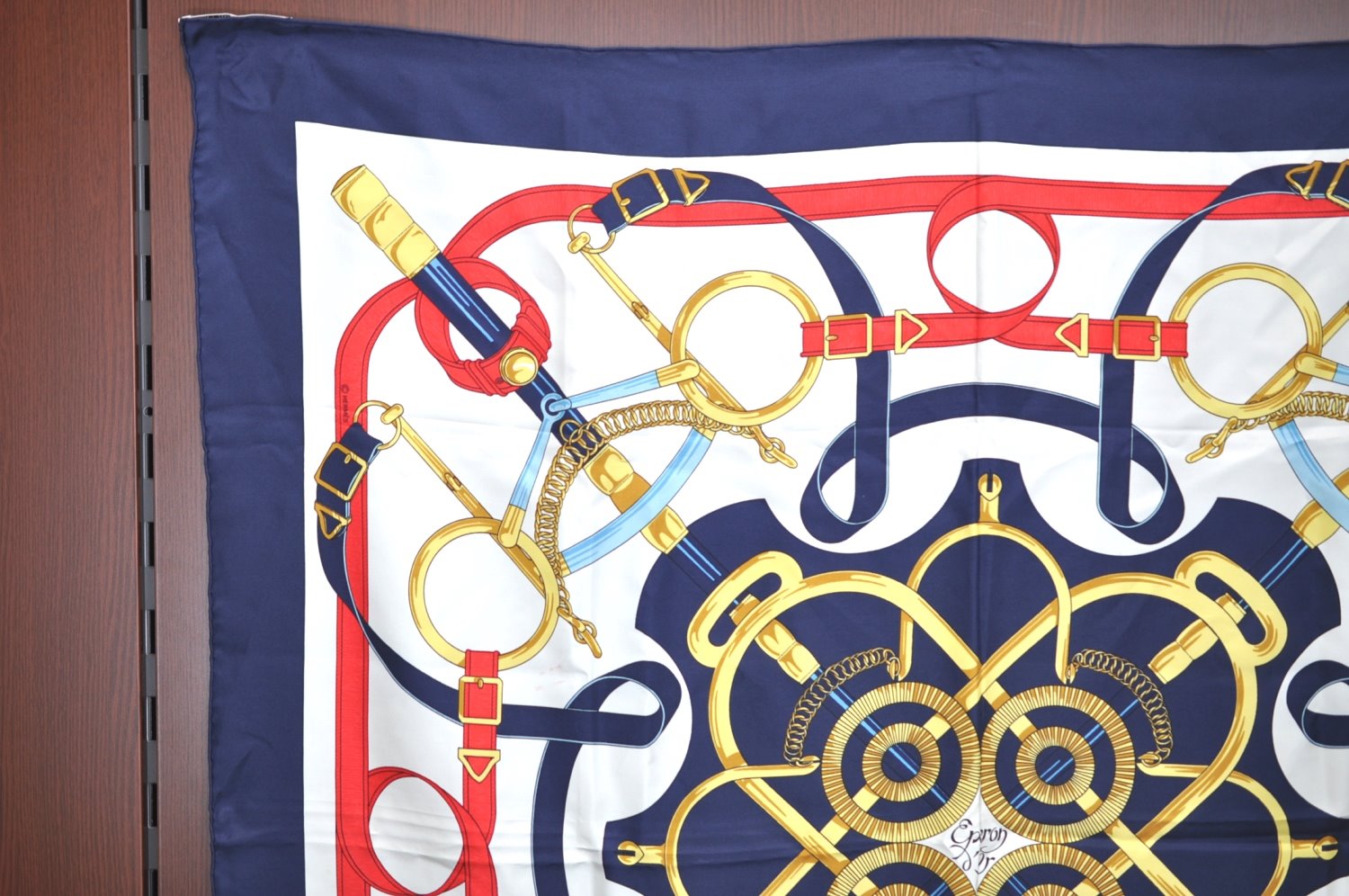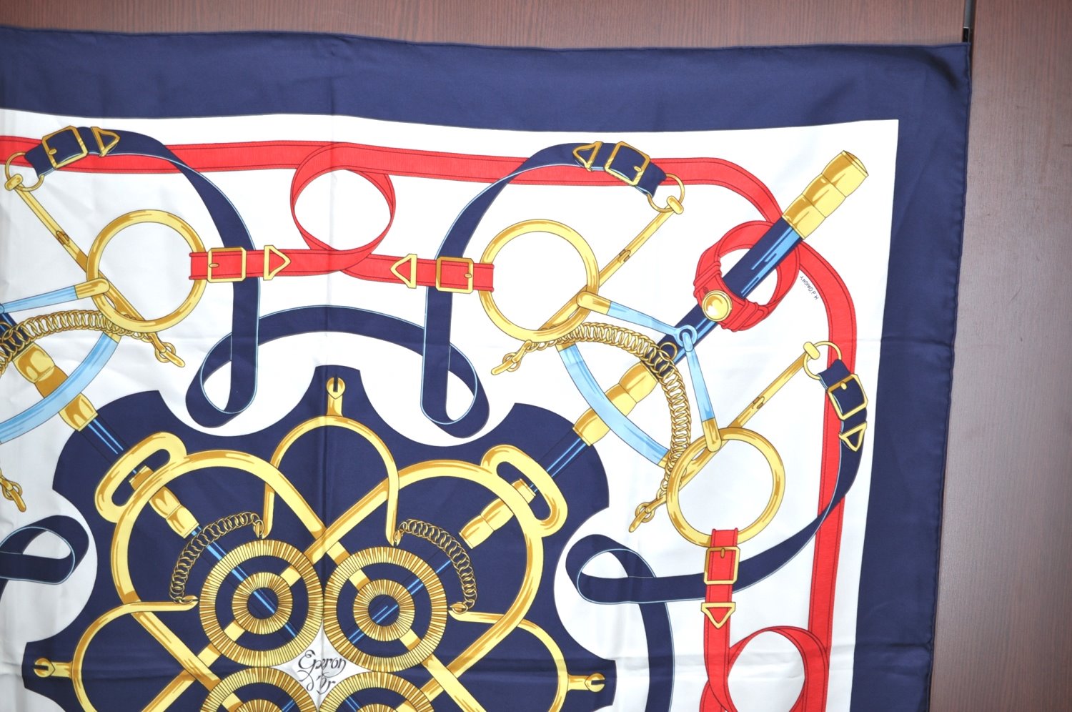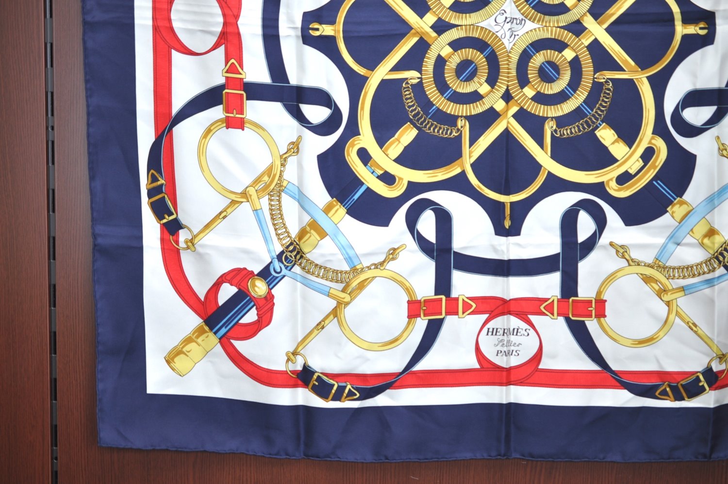 | Authentic HERMES Carre 90 Scarf "Eperon dfor" Silk Navy | |